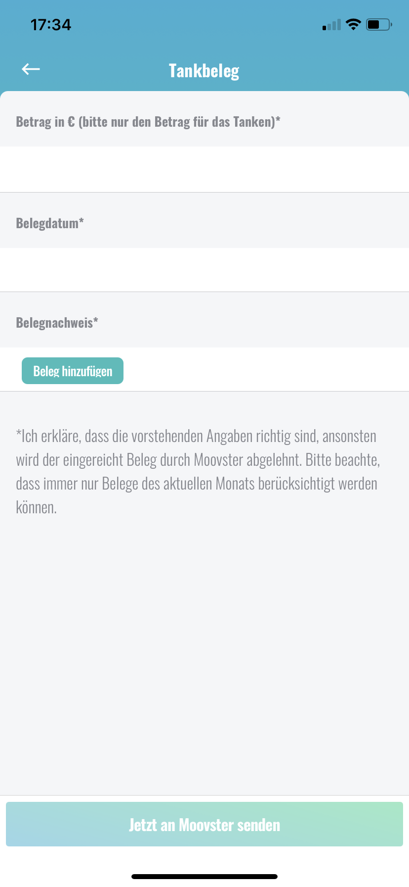 Du kannst ganz einfach deinen Tankbeleg in Papierform oder PDF über die Moovster App einreichen damit dieser gegen Dein Mobilitätsbudget verrechnet werden kann.
